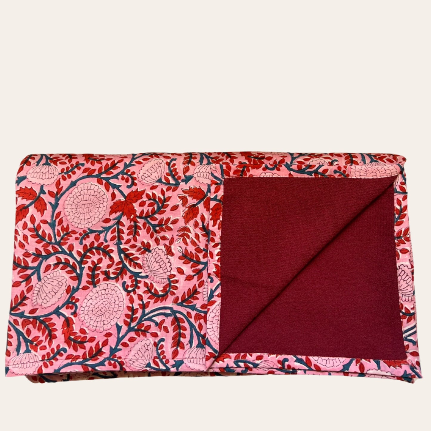Beautiful block printed 100% cotton on one side and Terry towelling on the other side in a complimentary colour.