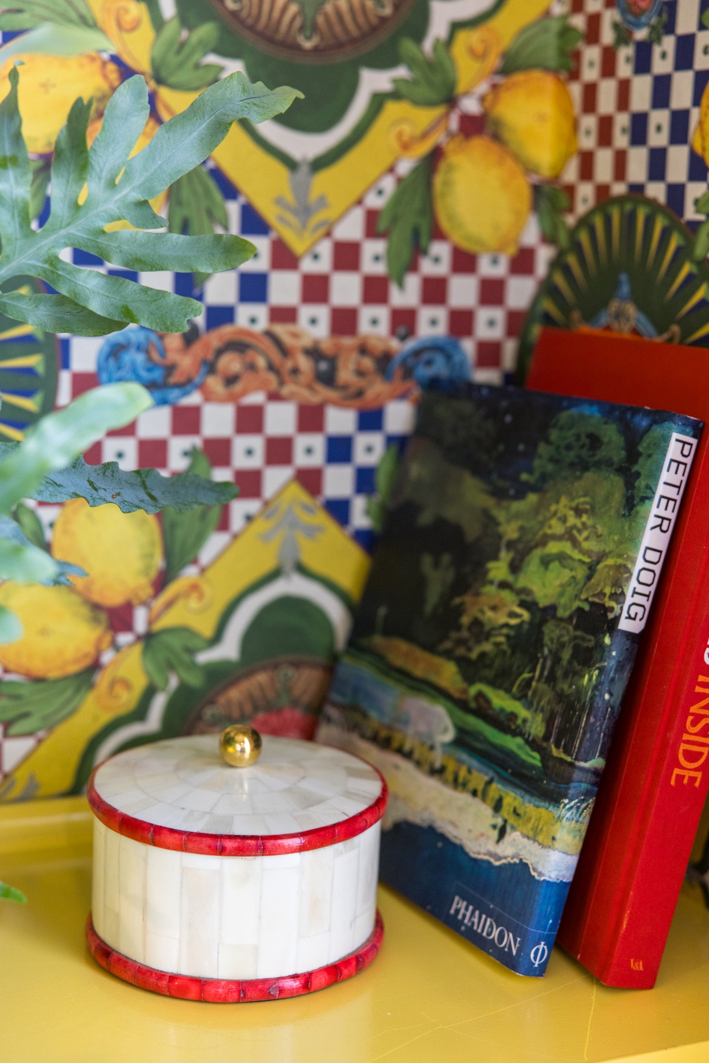 Each piece is made by hand. Every slither of bone is dyed and then stuck on by hand to the wooden base. The pieces of bone absorb the dye in slightly different ways resulting in beautiful tonal variations. As a result there will be slight irregularities in every pot adding to their individuality and uniqueness.