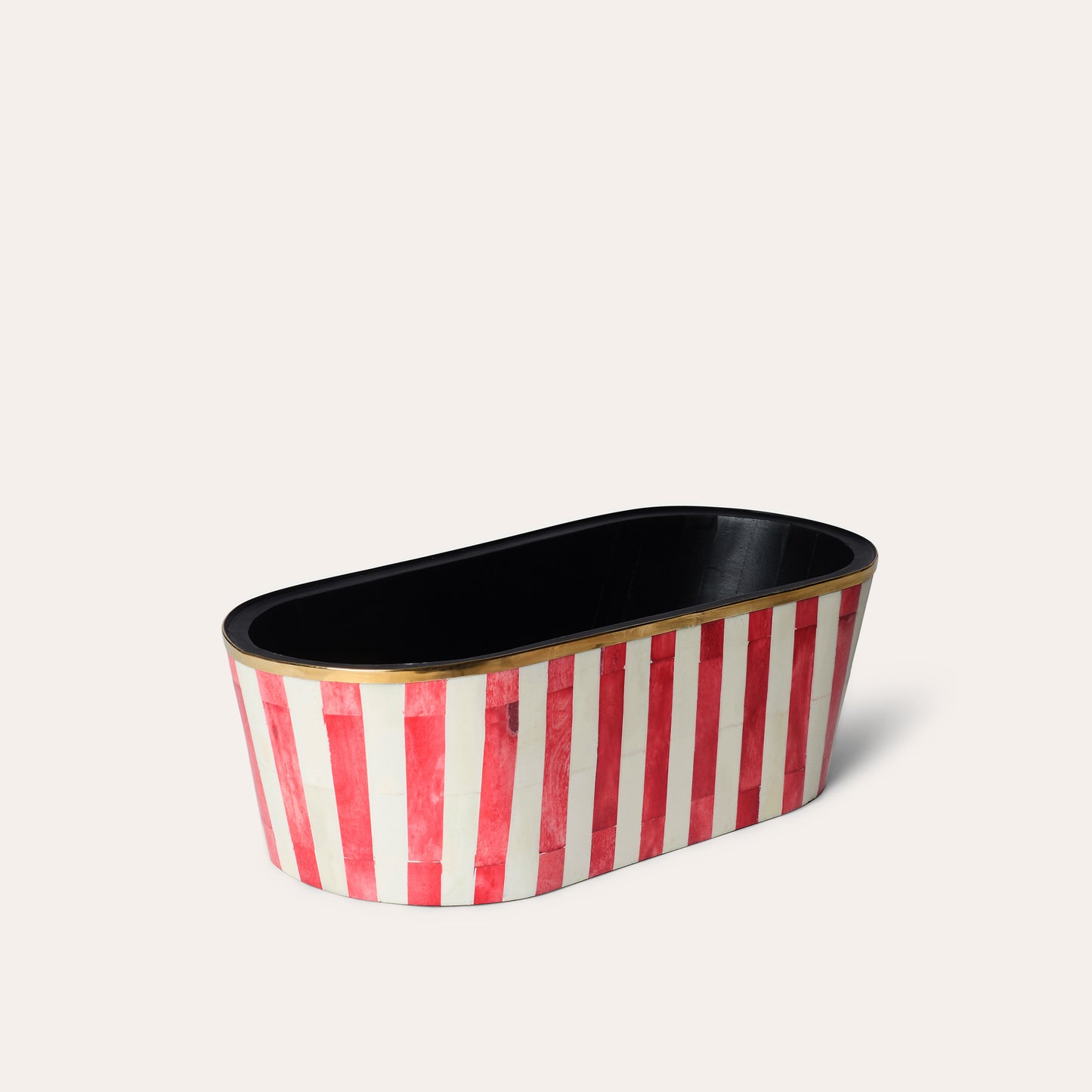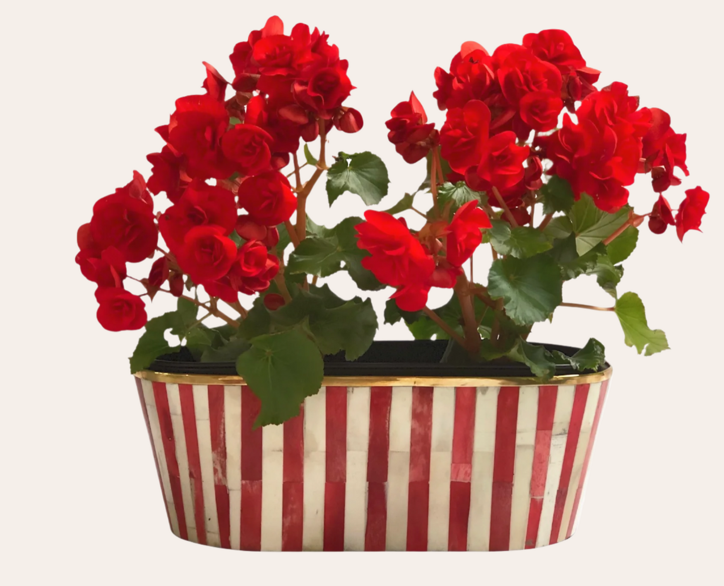 The planters are handmade and every piece of bone inlay is dyed and then stuck on by hand to the wooden base. Each piece of bone absorbs the dye in a slightly different way resulting in beautiful tonal variations. Therefore there will be slight irregularities in every planter adding to their individuality and uniqueness.