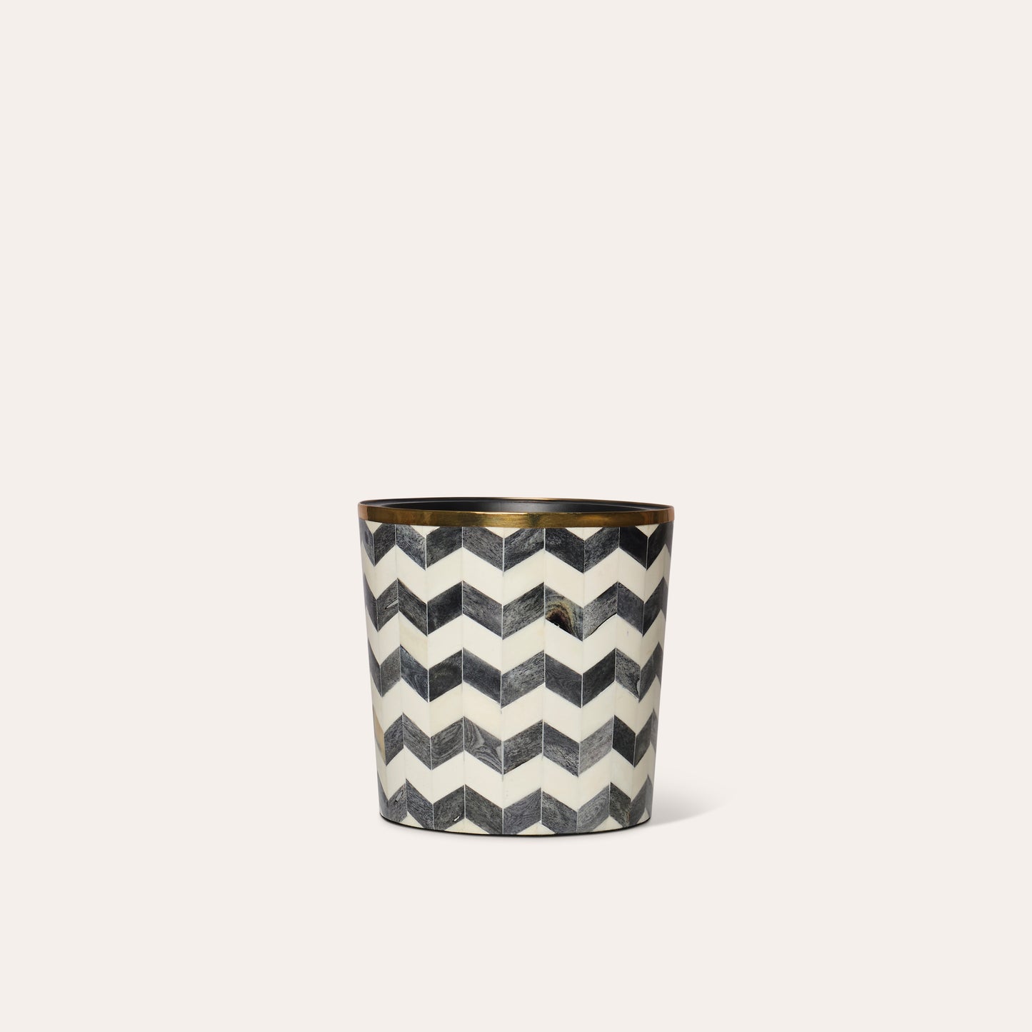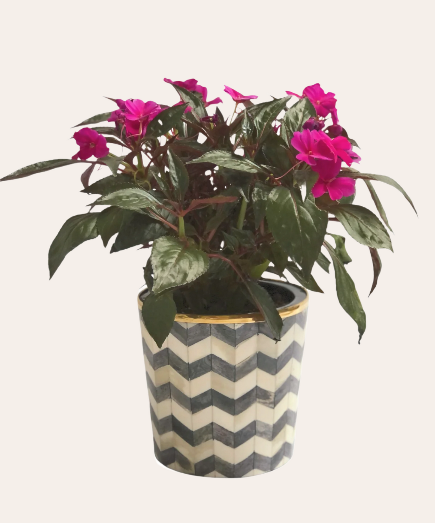 The planters are handmade and every piece of bone inlay is dyed and then stuck on by hand to the wooden base. Each piece of bone absorbs the dye in a slightly different way resulting in beautiful tonal variations. Therefore there will be slight irregularities in every planter adding to their individuality and uniqueness.