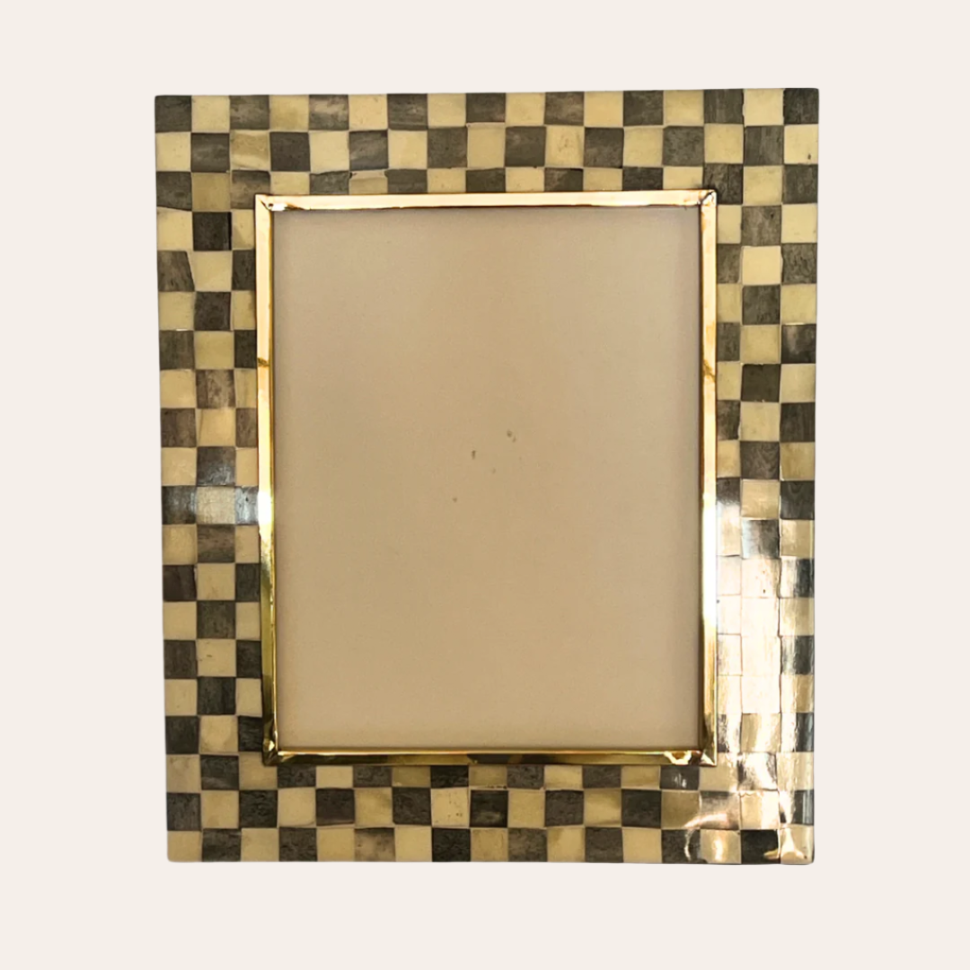 Großer, grau-weiß karierter Rahmen mit Knocheneinlage und handgehämmertem Messingrand. Jeder Rahmen bietet Platz für ein 25,4 x 20,3 cm großes Foto und kann im Hoch- oder Querformat aufgestellt werden.