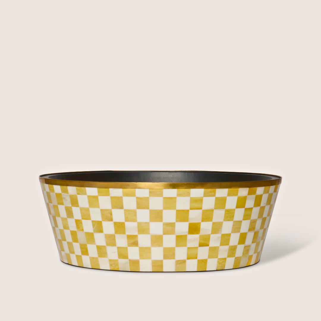 Unser originaler großer Bone Inlay-Pflanztopf mit Messingrand im Schachbrettmuster.