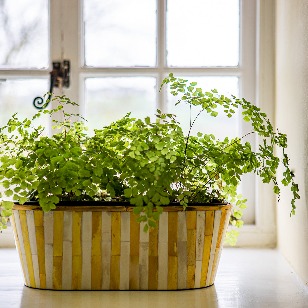 Unsere länglichen Pflanzgefäße eignen sich perfekt für Konsolentische, Fensterbänke oder rechteckige Tische. Jeder Pflanzkübel wird mit einem Einsatz aus Blech geliefert, der das Arrangieren und Gießen der Pflanzen erleichtert. Der Boden ist außen mit Filz ausgekleidet, um Kratzer zu vermeiden.