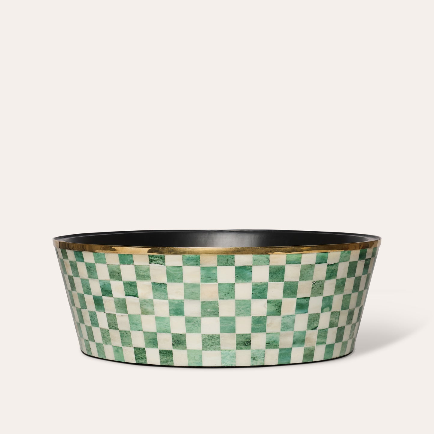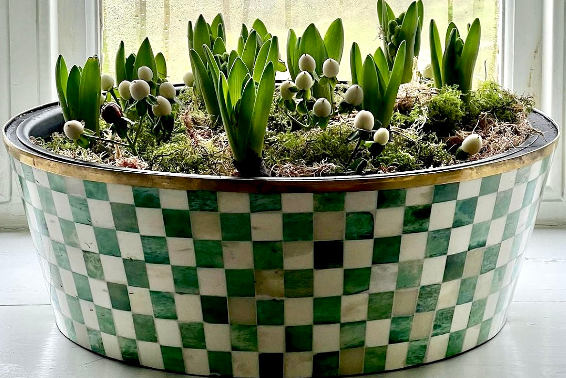 Unser originaler großer Bone Inlay-Pflanztopf mit Messingrand im Schachbrettmuster.