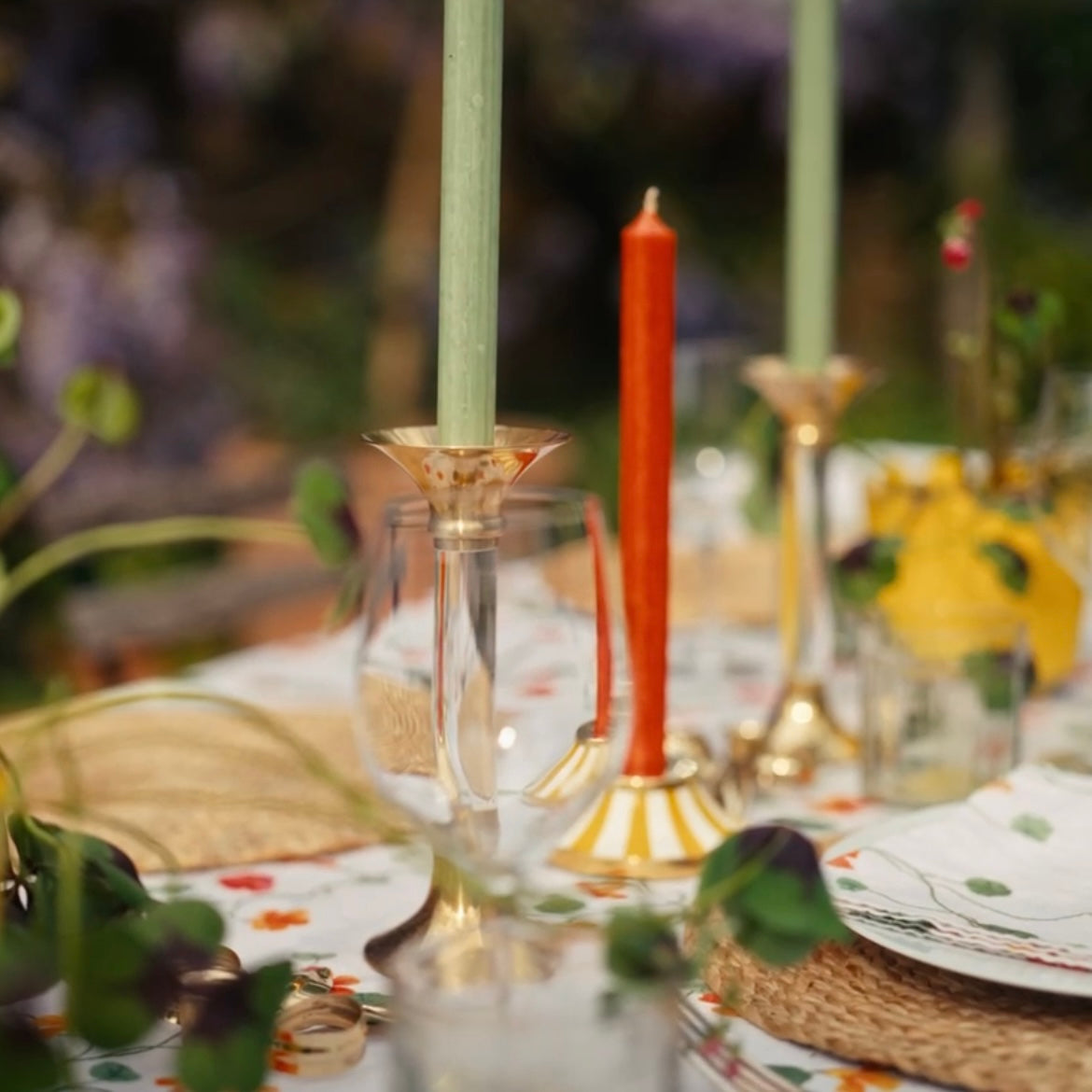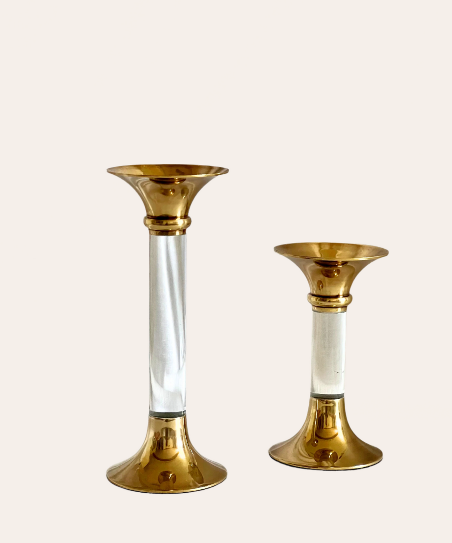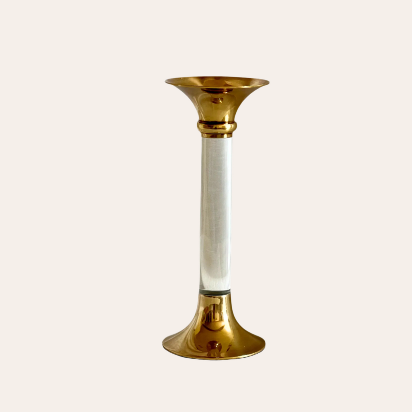Precio regular £30.00A classic column shaped candle holder in brass and acrylic, the play of light through the acrylic, and the way it bounces off the brass, make these a very eye-catching addition to the table.