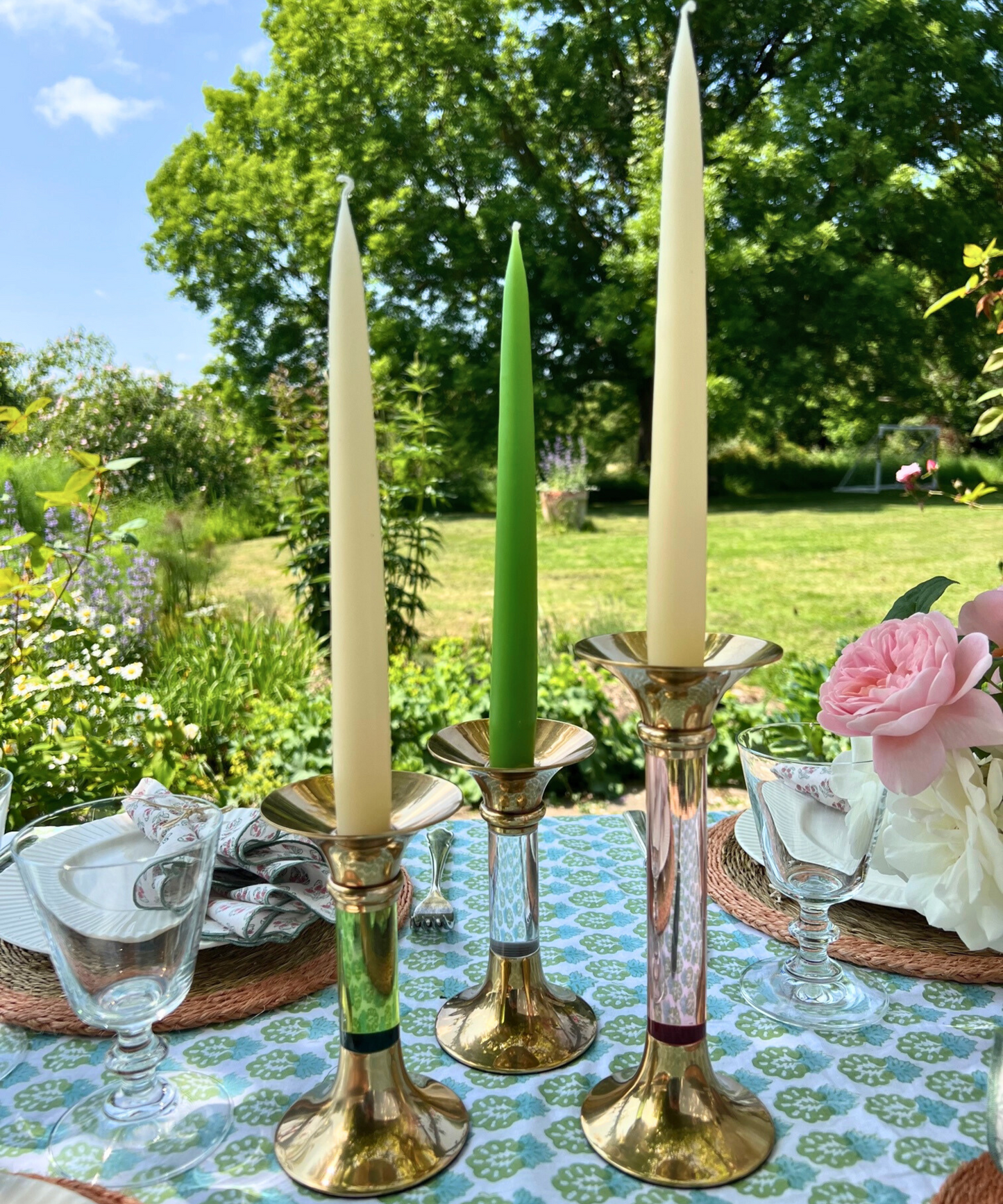 Precio regular £30.00A classic column shaped candle holder in brass and acrylic, the play of light through the acrylic, and the way it bounces off the brass, make these a very eye-catching addition to the table.
